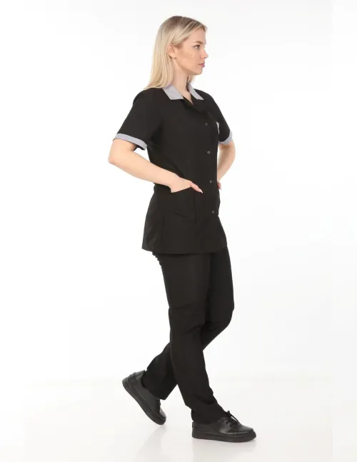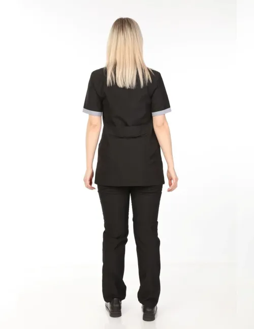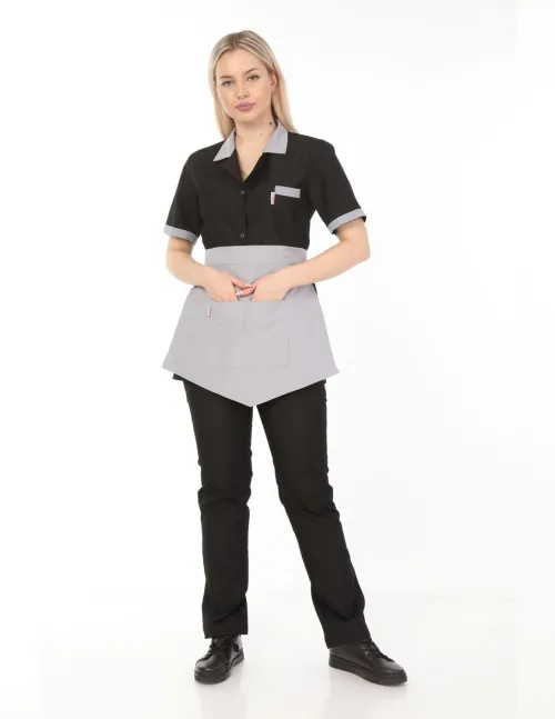 Önlük, yaka ve kollarda mor saten bir bant ile süslenmiştir. Bu bant, takıma şık bir görünüm kazandırır.
